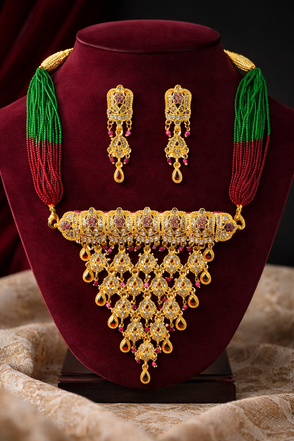 This set showcases exquisite craftsmanship with embedded Kundan-style stones and vibrant pink accents that create a rich, luxurious appeal.