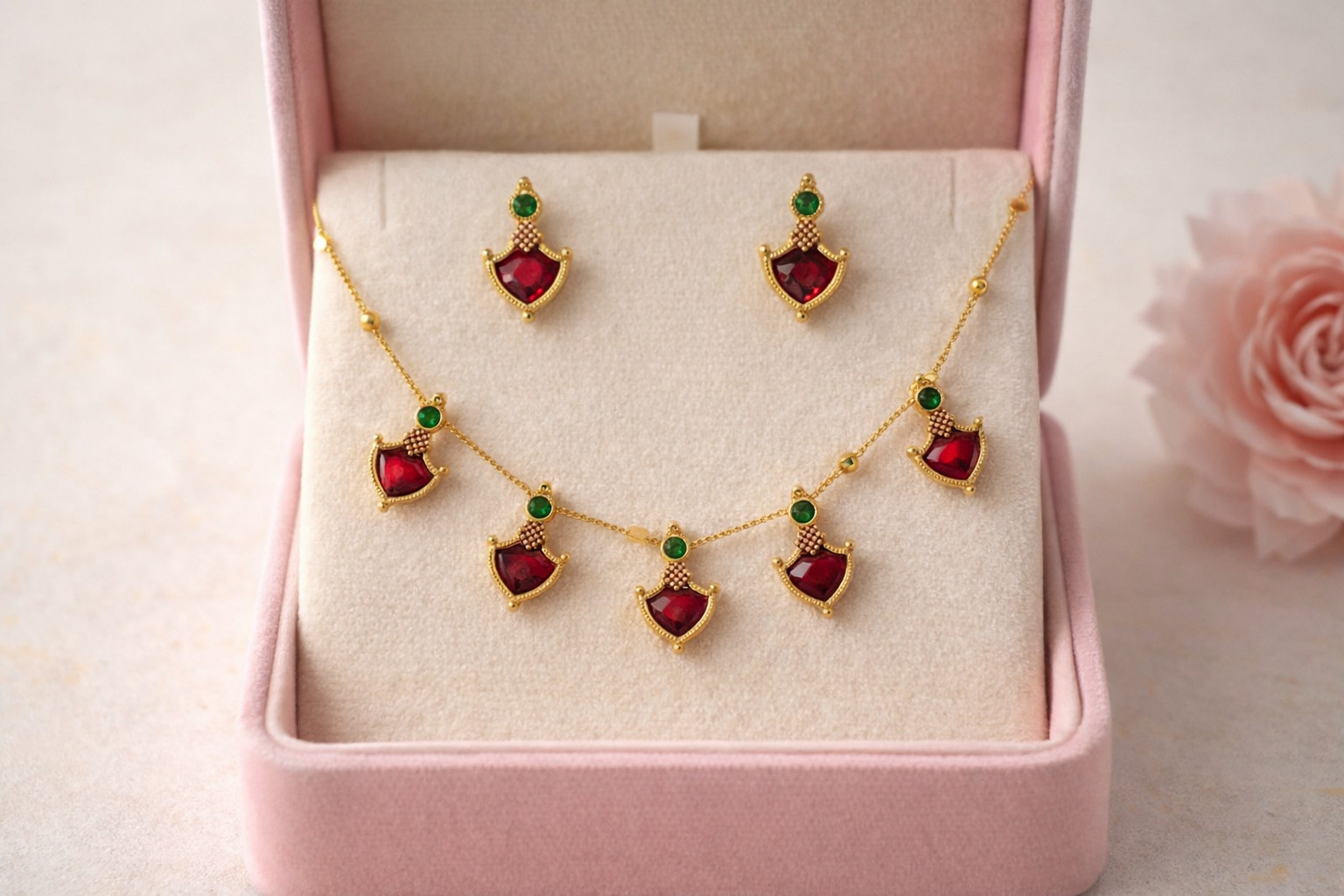 Traditional Ethnic Gold Plated Red Green Stone Necklace & Earrings Set for Women & Girls