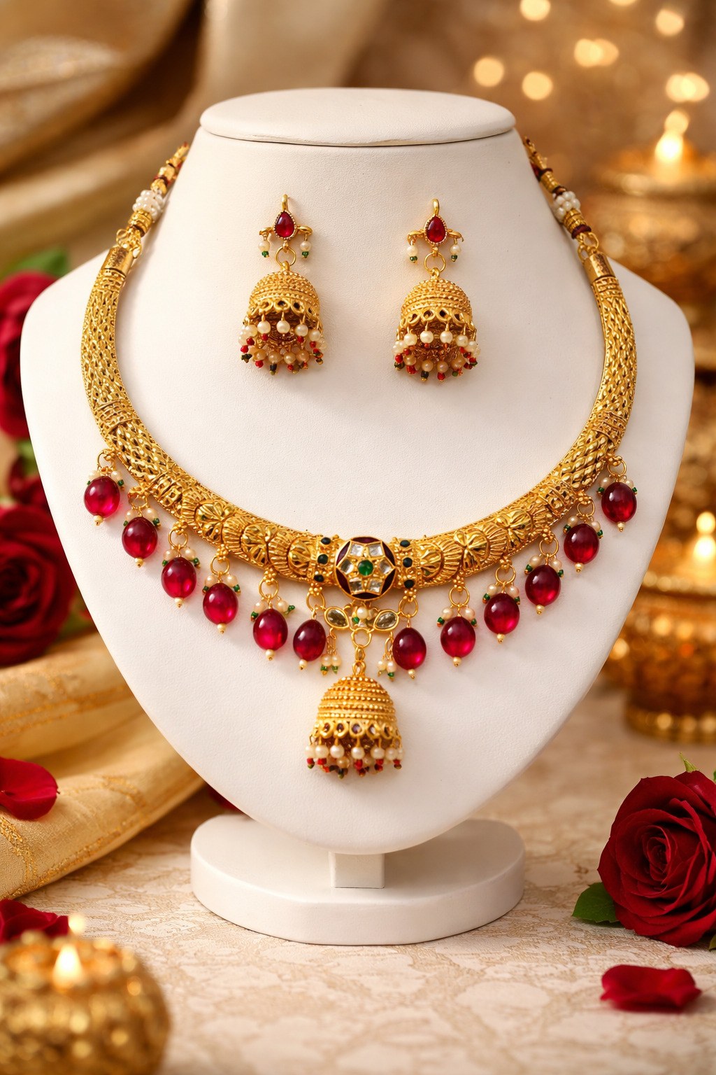 Traditional Gold Plated Kundan Necklace Set with Jhumka Earrings for Women & Girls