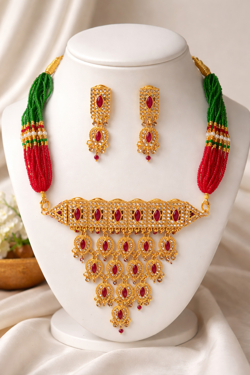 This set showcases exquisite craftsmanship with embedded Kundan-style stones and vibrant pink accents that create a rich, luxurious appeal.
